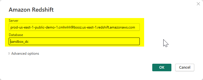 In the pop-up window, enter the URL for the Redshift database server cluster.