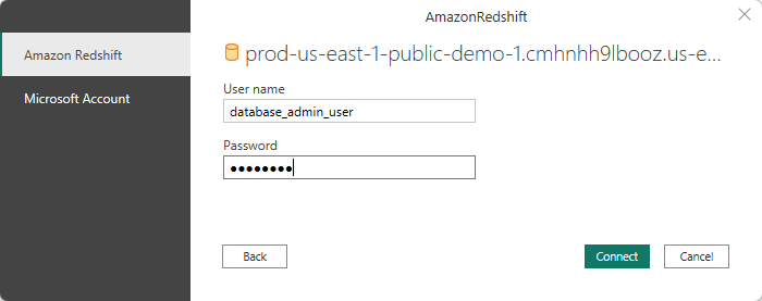 Enter the database username and password. This is an assigned redshift database user and will not be a credentialed One Model user.