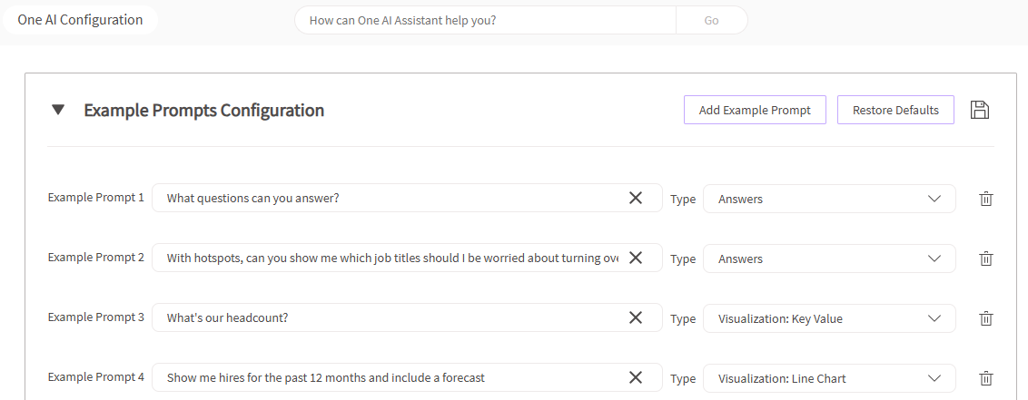 Example prompts appear on the Assistant's landing screen to help users get started. You can customize these prompts to reflect your organization's most common questions, themes, or preferred phrasing. Each prompt can include an icon for its associated feature or visualization type image. Prompts can also be reordered by dragging and dropping: click and hold the numbered prompt header (for example, Example Prompt 1), move it to the desired position, and release. After you click Save, the new order will be applied for all users.