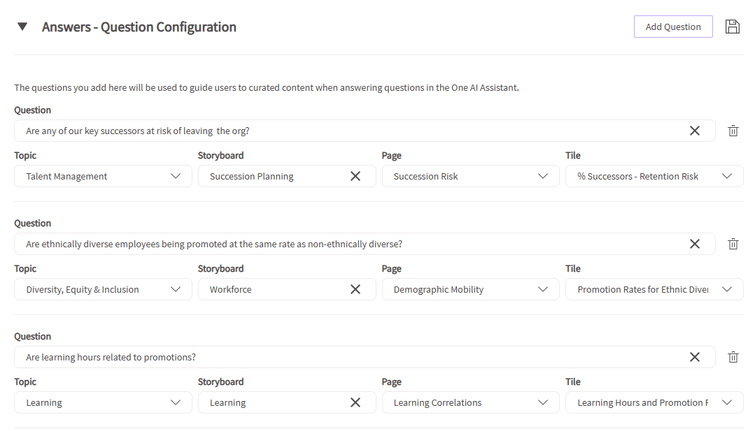 This section allows you to define specific questions and link them to existing content by assigning a topic, a storyboard, a page within that storyboard, and a specific chart or tile. These curated questions appear in the Answers experience and help guide users directly to the most relevant visuals.Answers - Question configuration via One AI Configuration