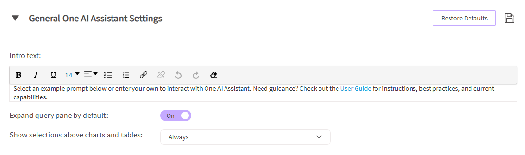 Access to One AI Assistant is controlled by a set of permissions that determine what users can see and do. These include features like Answers, Insights, Visualizations, and Storyboard Navigation. You can combine these permissions to give different users the right level of access based on their role. To learn more about these permissions—and how they fit into broader role-based access across One Model—see the One AI Generative AI section in our One Model Roles and Permissions reference guide.