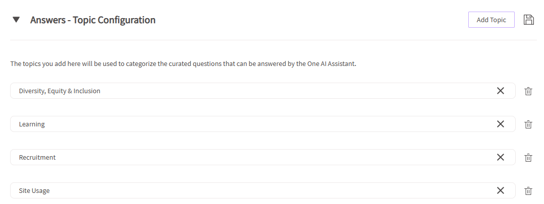 Topics allow you to group related questions in the Answers experience. These are user-defined categories like “Recruitment,” “Learning,” or “Site Usage” that help organize curated content.Answers - Topic configuration via One AI Configuration