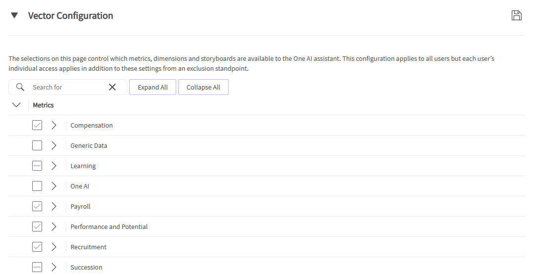Vector configuration defines what content the Assistant can use when interpreting user prompts in the Visualizations and Storyboard Navigation tools. Metrics and dimensions are used in chart-based queries, while storyboards determine where the Assistant can navigate when users ask to explore existing content. The Assistant also uses dimension node values (e.g., “Chicago,” “Level 3”) to support filtering. Avoid including dimensions with PII in their nodes, such as employee names. This configuration works in combination with data access roles. If a user doesn’t have access to a metric or dimension—even if it’s configured in the Assistant—they won’t be able to query it. Likewise, if a user does have access, but the Assistant hasn’t been configured to include that metric or dimension, it won’t be available in the Assistant. For example, if the Gender dimension is enabled in the Assistant’s configuration but a user’s data access role does not permit access to the Gender dimension, that user will not be able to build queries using it in One AI Assistant.