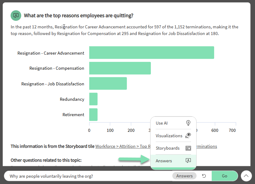 Using Answers Mode: In AI Mode, the Assistant decides whether to return an Answer, a Visualization, or a Storyboard. If you want to ensure your prompt is matched only against curated questions, switch to Answers mode so results always come from your organization’s configured library.