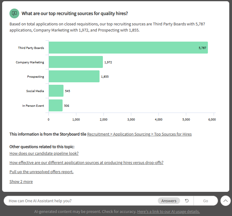 - Setup by admins - Site admins define key questions, organize them into topics, and tie them to Storyboard tiles. These configured questions can even be added to the list of example prompts displayed in the One AI Assistant dropdown.