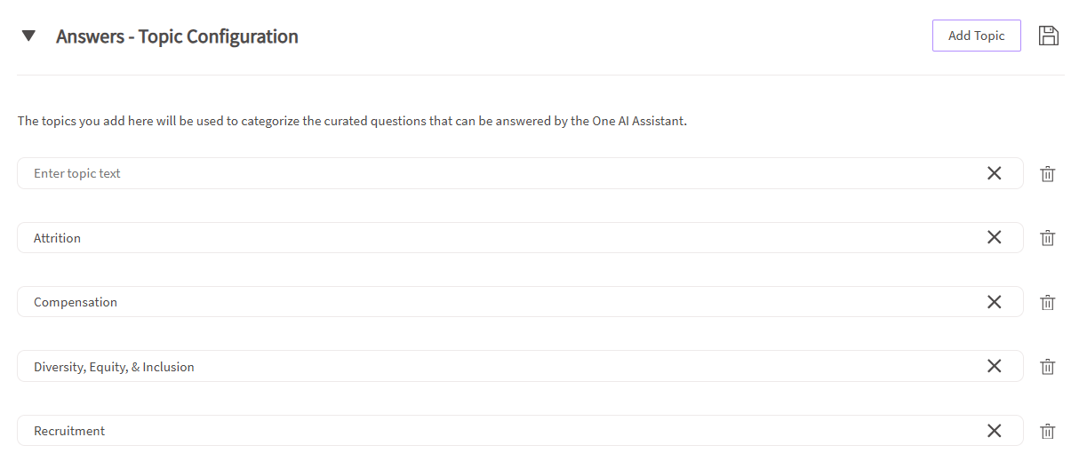 - To delete a topic, click the trash icon next to it (you cannot delete topics with related questions).