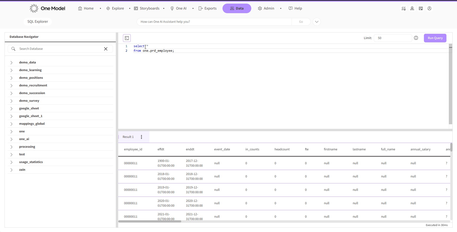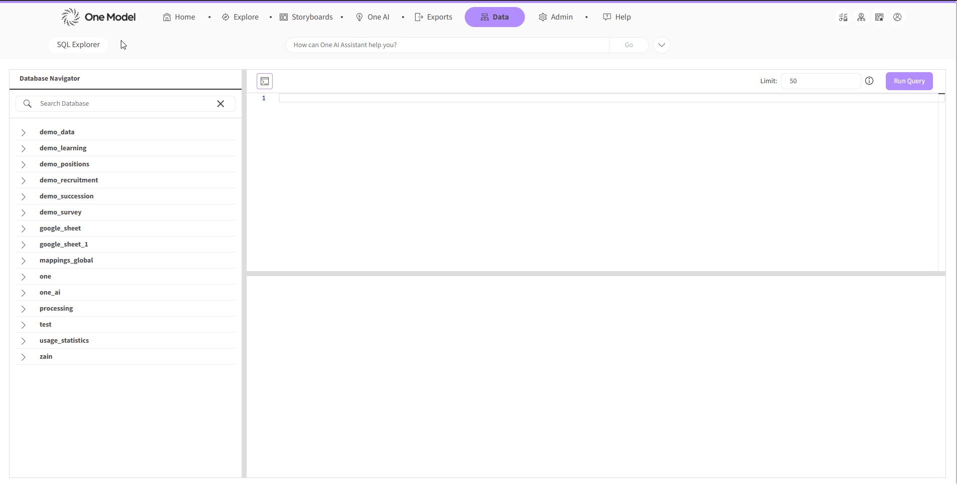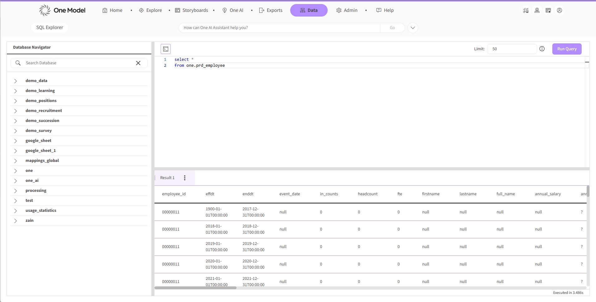 SQL Explorer is a built-in query tool that lets you write and run SQL statements directly within your One Model instance. Use it when you need to go deeper than what Explore or Storyboards provide, for example, validating that a metric is calculating correctly, checking raw values for a specific employee ID, or confirming that a data load completed as expected.
