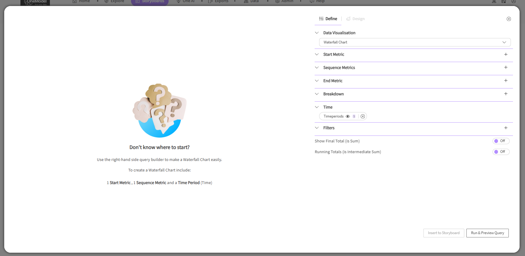 Before creating your Waterfall chart, you should already be familiar with the fundamentals of creating a basic chart or table. Learn more by reading our guide about Creating basic charts and tables, and the Beta Define (Explore in Storyboards) guide.