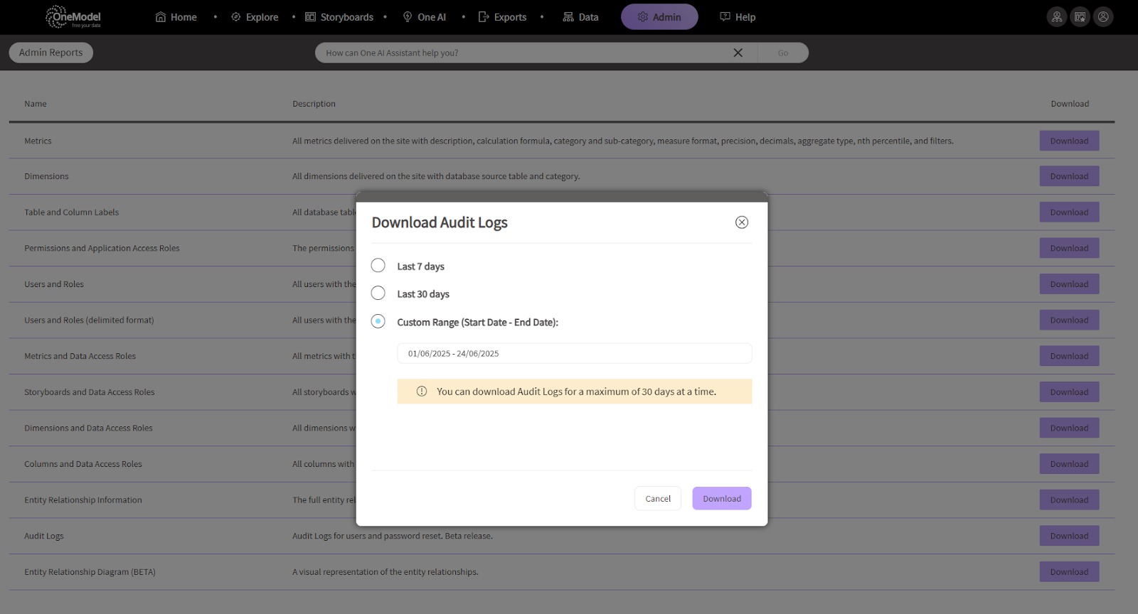 - Download Expiry: Once a log file is generated for download, that specific file remains available in the Admin Reports UI for 14 days. After 14 days, the file is deleted from the list, though the underlying data remains archived in the system.
