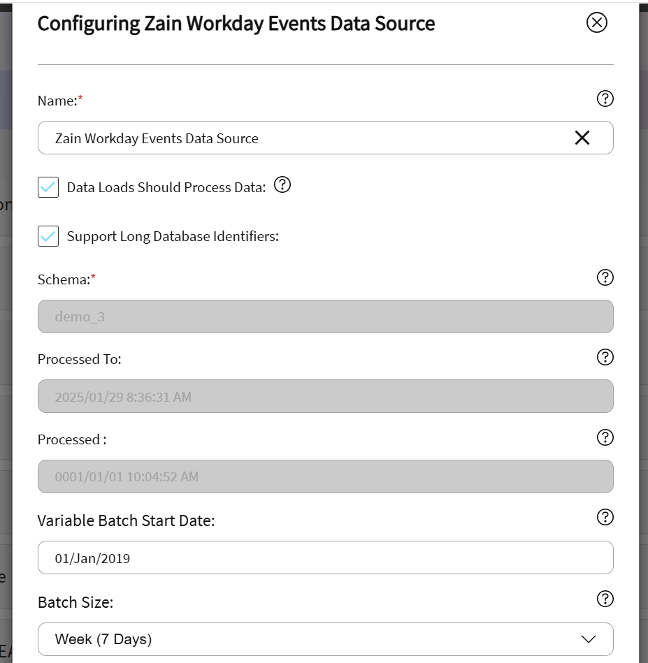 - Provide a data source name and schema for storing the Workday data. The pre-filled or pre-selected fields can remain unchanged.