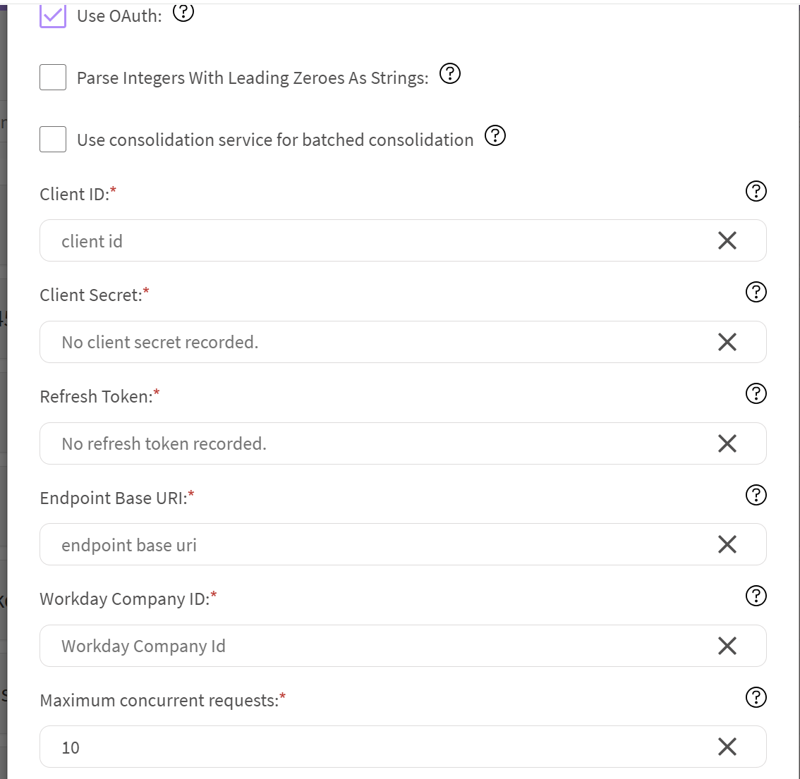 4. Enter the client ID, client secret, and refresh token for the oAuth option. Note: Use this option if you would like to setup workday data source using OAuth.