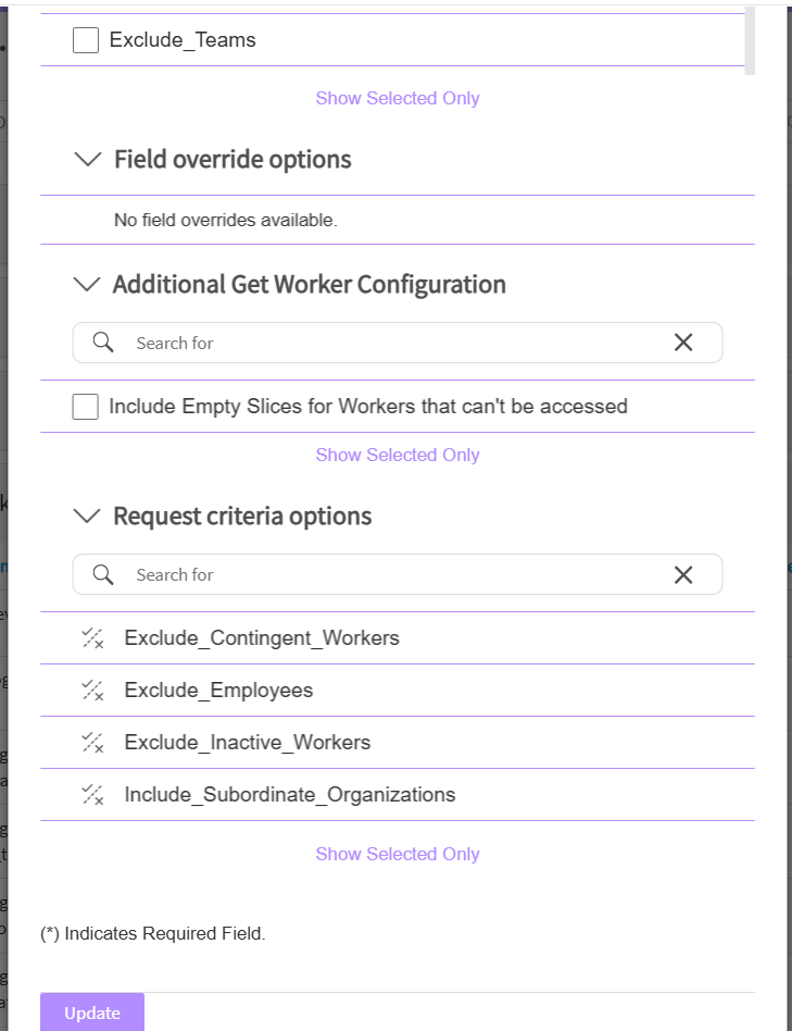9. The field override options lets workday data source retrieve additional information from Workday data source using Workday’s Integration Field Override Data feature. To do that, Workday data source configuration requires both the "data source workday data source" checkbox and "enable field override" to be active at the Workday instance level.