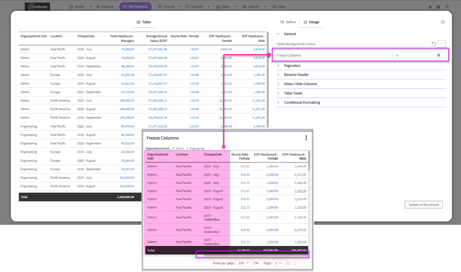 - You can now freeze columns in List Tables to keep them visible while scrolling horizontally. This helps maintain context and navigate large datasets more easily. The new Freeze Columns setting is found under Design > General. For basic list tables, you can freeze any number of columns, and for pivoted list tables, you can freeze non-value columns. (ref 25399)