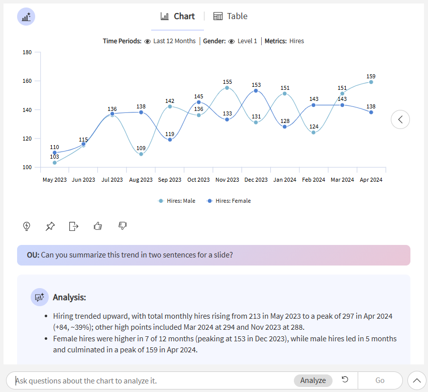Analyze lets you have a back-and-forth conversation with the chart in front of you, right inside One AI Assistant. Every conversation is grounded in your organization’s data, providing answers you can trust and share. It’s a flexible tool for uncovering insights and understanding how to act on them.