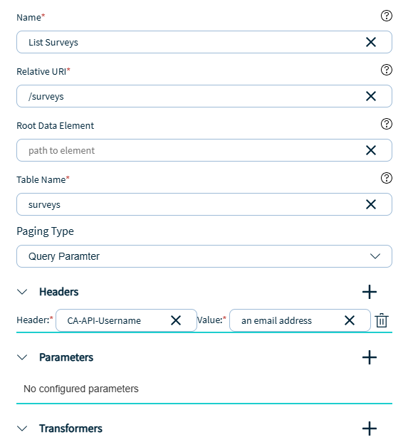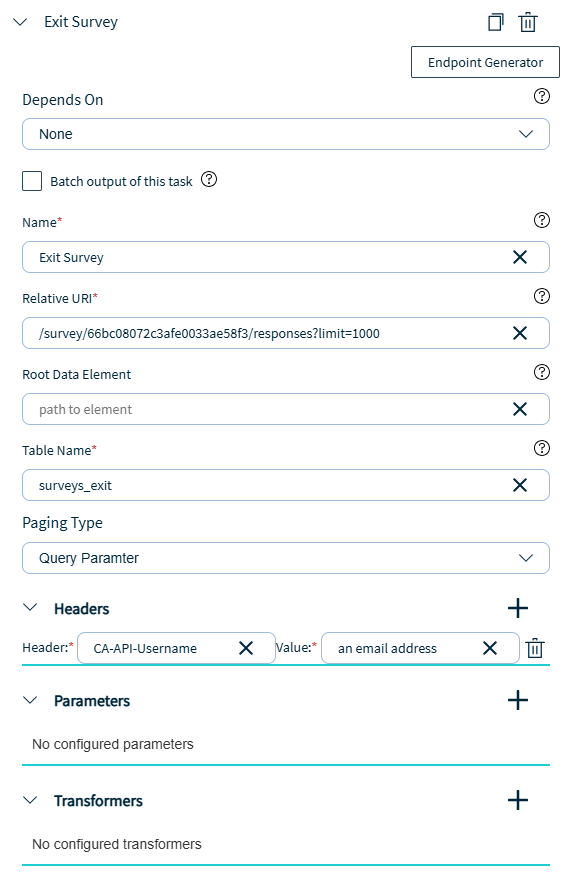 The first one is an API end point for retrieving a list of surveys with the following configuration.