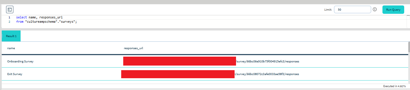 You need to find the ### component by looking at the response_url in the surveys table. To do that, open SQL explorer, and find the responses_url by running this SQL query shown in this screen. In this example the survey id is 65949755b62477002bf50d36