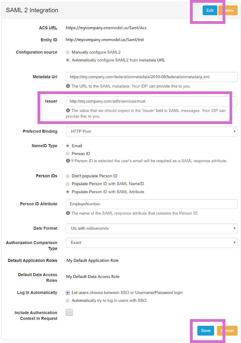Click Edit next to the SAML 2 Integration section and then update the Issuer details (based on the latest information from your IdP), then scroll to the end of the SAML 2 Integration section to save.