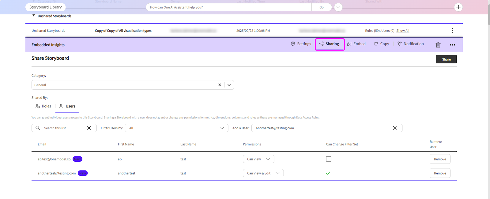 - You can now share Storyboards directly with individual users, making it easier to collaborate while still respecting existing data security rules. Users with the appropriate sharing permission can grant access to specific Storyboards, and recipients will only see data allowed by their Data Access Roles. Before sharing, a category must be selected (or created), and unshared Storyboards will automatically move into the chosen category when shared. The Storyboard Library continues to show who a Storyboard is shared with, and a new admin report is available (for those with admin-report access) to help monitor and audit shared users.