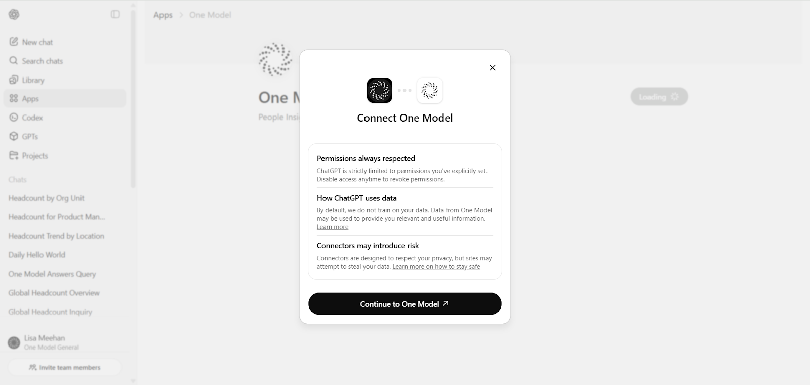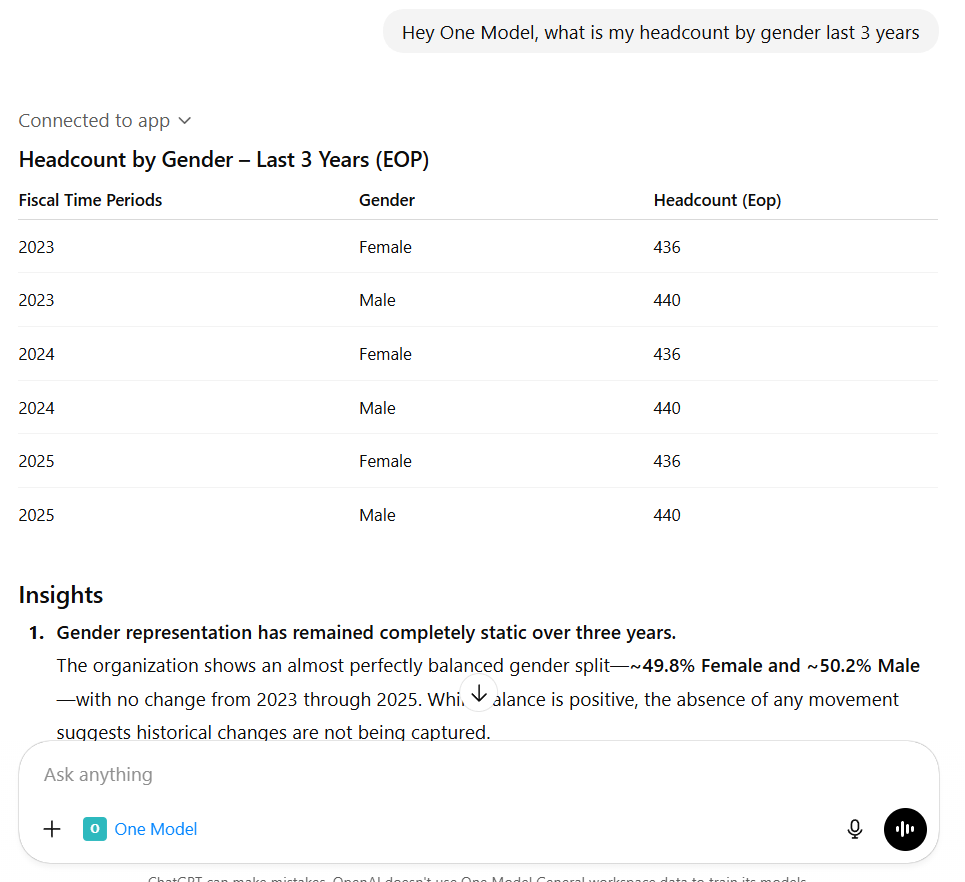 Once connected, ChatGPT can securely query governed workforce metrics from One Model and incorporate those results directly into conversational workflows such as analysis, document drafting, reporting, and presentations.