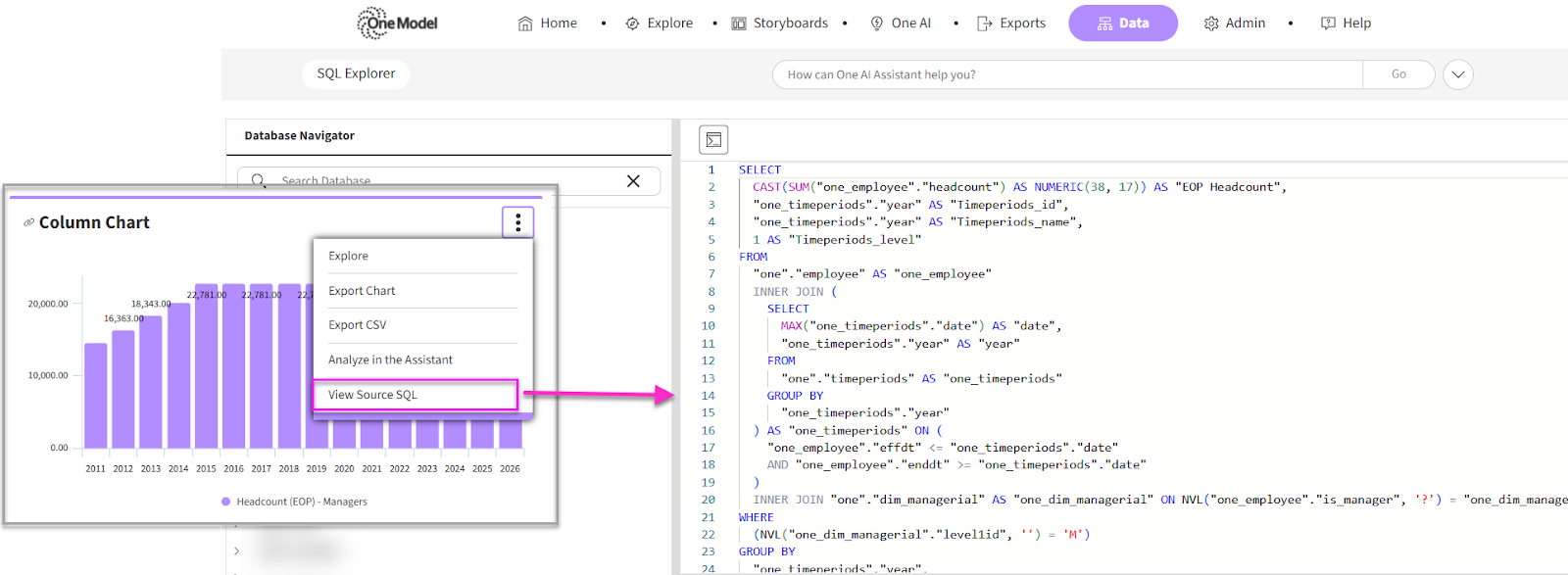 - We added a new feature for users to be able to view the SQLquery behind a One Model chart or table and see the details in SQL Explorer. This will be available for all users who have access to SQL Explorer, and can be accessed using the menu button on tiles in a storyboard (ref 25677)