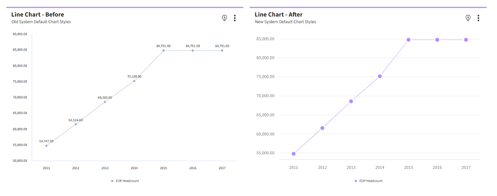 We have introduced New System Default Chart Styles to provide a modernized look for all your data visualizations. These updated defaults are designed to improve readability and visual impact across your storyboards by optimizing hundreds of backend settings automatically.