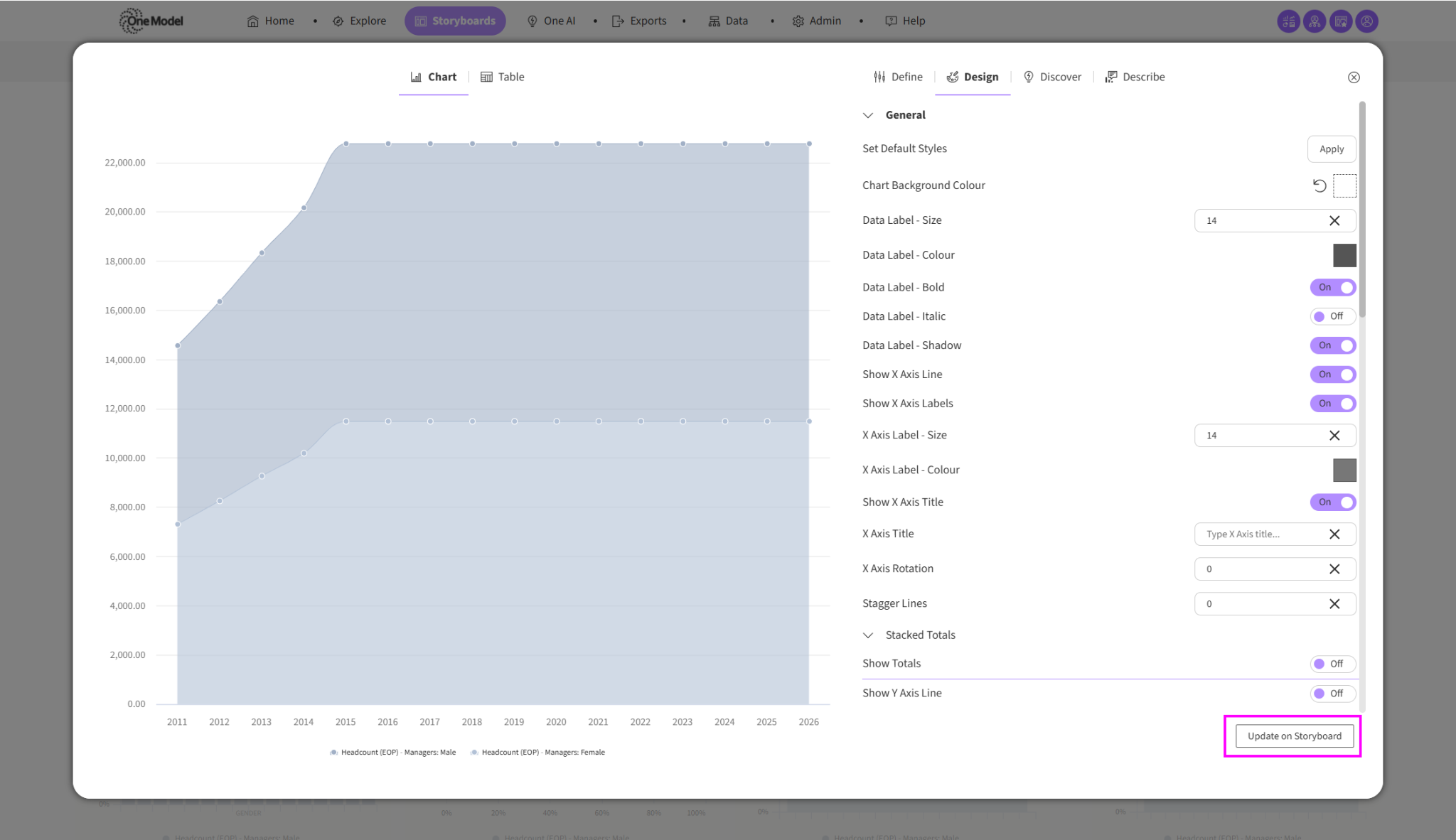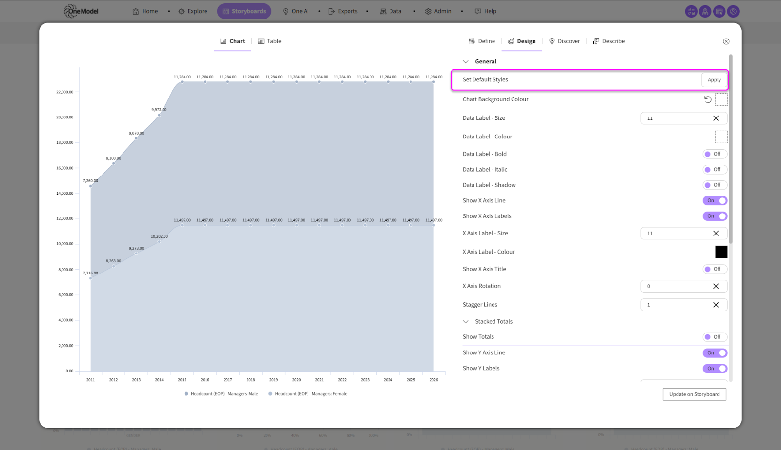 - User: Users with the Application Access Permission 'CanCreateStoryboard' and the Storyboard Permission 'Can View & Edit' can ‘Set Default Styles’ within each individual chart’s design tab within a Storyboard.