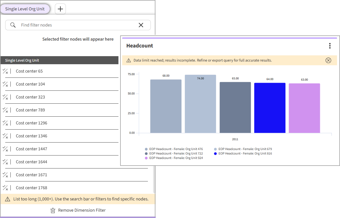 - We’ve updated the messaging in Storyboards and the Define Panel to be more helpful when you're working with large sets of data. Instead of the 'Node list truncated' warning, you’ll now see a clearer message: 'List too long (1,000+). Use the search bar or filters to find specific nodes.' This warning appears when a single level in a hierarchy has more than 1,000 items, making it obvious that the list is capped and giving you a quick tip on how to find exactly what you're looking for (ref 26279).