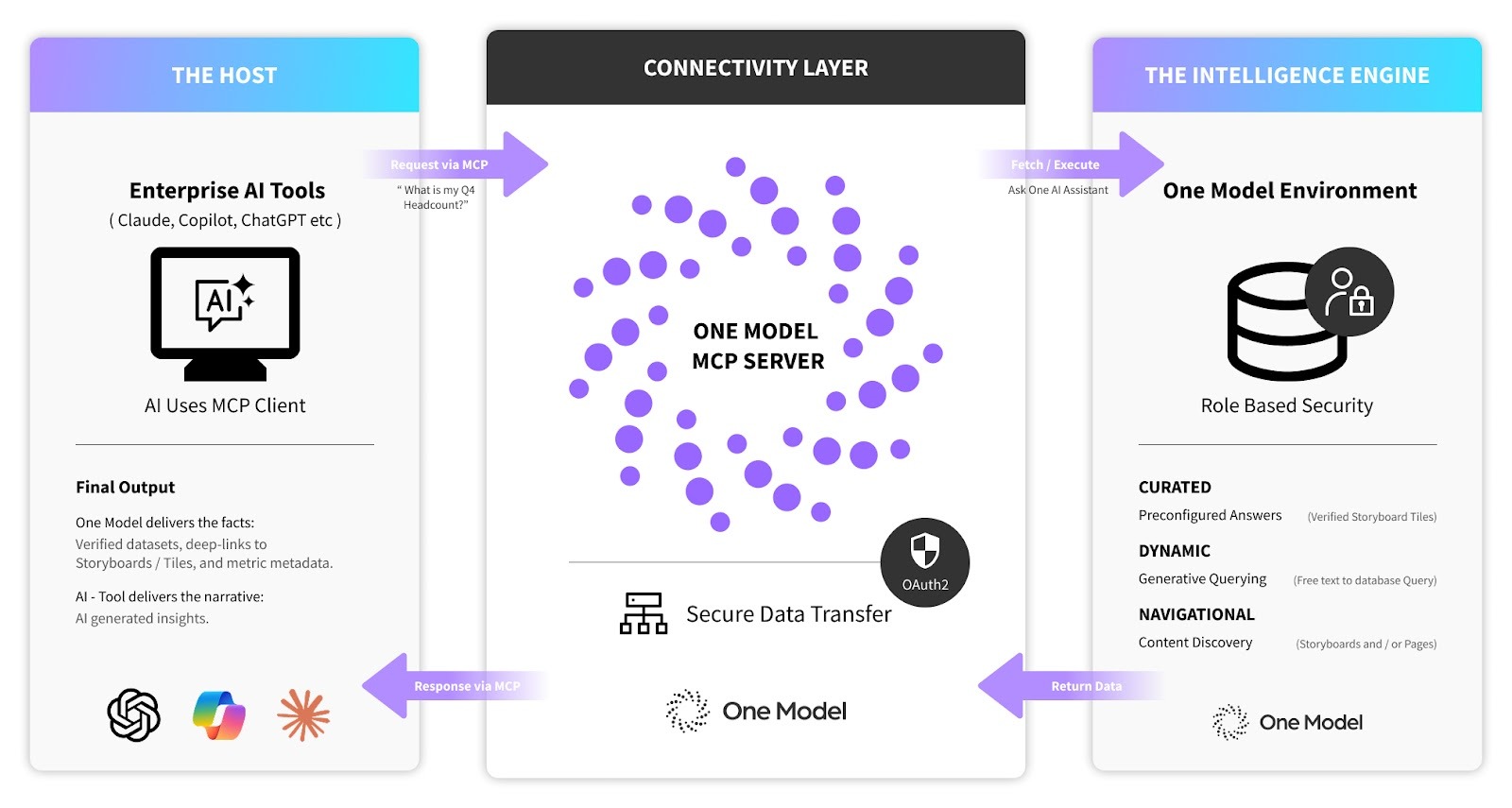 The AI does not guess your metrics. While the Enterprise AI (like Copilot or ChatGPT) provides the interface, the actual numbers are fetched directly from One Model via the MCP Server. You are accessing the same verified, governed results that live within your One Model platform.