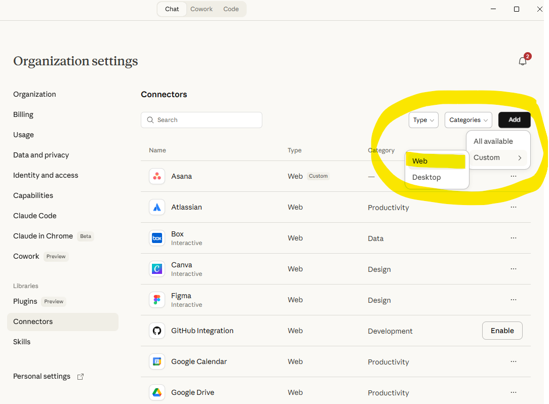 - Click the Add button on the top right of the page and select Custom Web connector
