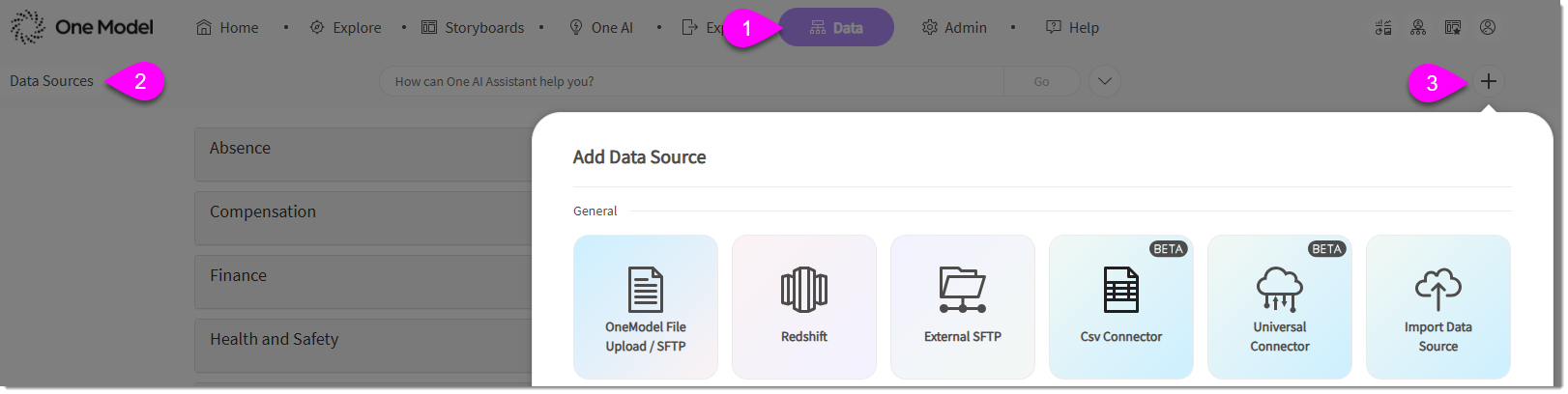 One Model provides generic connectors which can be configured to the required data source, and data source specific connectors which have a built-in understanding of the data source. Connectors can be found in the Add Data Source menu on the Data > Sources page: