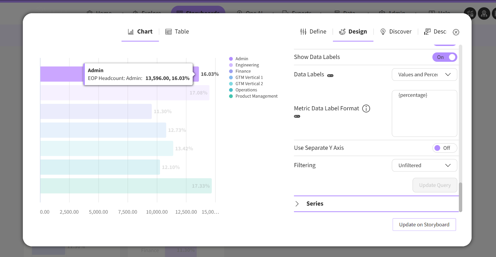 You can now choose to display data labels as values or percentages on non-stacked basic charts. This makes it easier to show proportional context alongside (or instead of) absolute values without the need to create a separate metric. Learn more about the Basic Charts Options in Define or How Percentages are Calculated. (ref 27767).