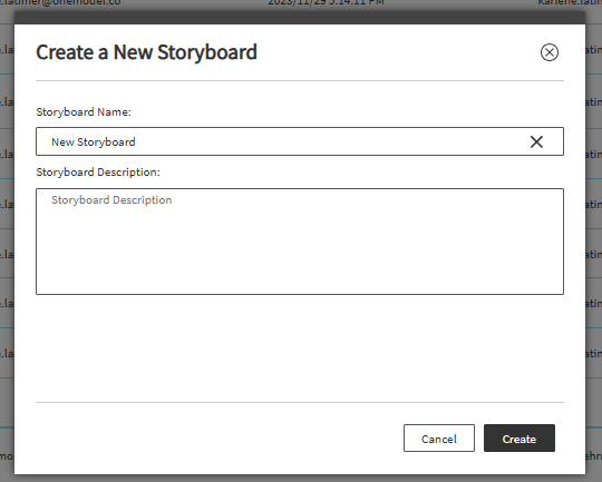 - From here, a pop up screen appears where you will add 1) Storyboard Name, and 2) Storyboard Description. Click Create.