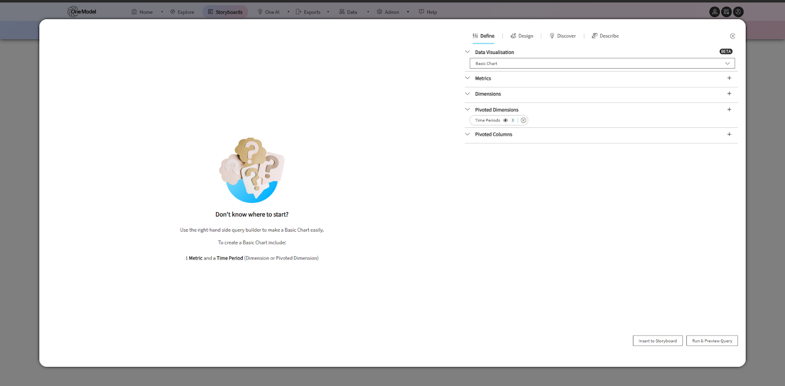 - If you select anything from the Create New menu, you will be taken to the Visualization Settings Panel where you can build your query in the Define panel. The Define tab enables you to build and edit queries in Storyboards. Select your data visualization type then add your metrics, dimensions, pivoted dimensions and pivoted columns.