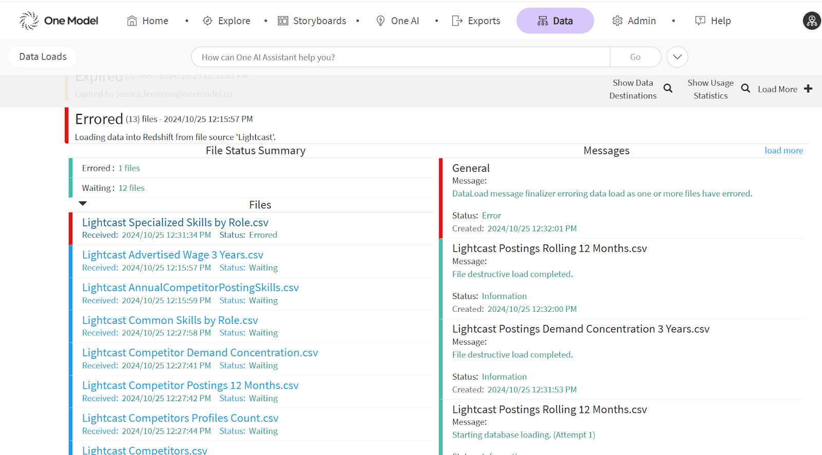In the example below, from the Loads page, you can see 13 files were uploaded, and 1 file has errored.
