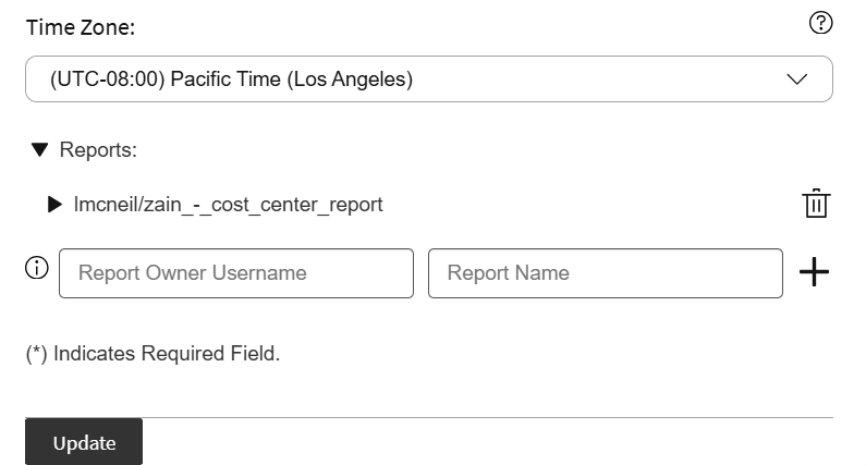 Now that the connector is configured, we should be able to start adding reports. To do this, simply add the username of the Report Owner, and the name of the report into the respective fields, and hit the + button: