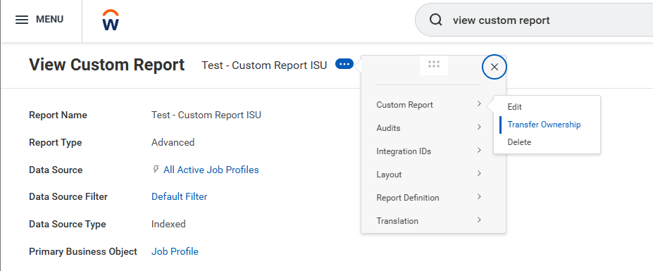 To ensure that there aren’t problems in the future with the integration it is recommended that you transfer the ownership of the custom report to your ISU. You can then transfer the ownership of the report via this menu in the view custom report screen: