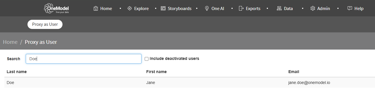Proxying is a great admin feature that allows a user to see exactly what another user is seeing in One Model. The ability to proxy cannot be limited, so only users that have full admin permissions should be given the right to proxy in One Model.