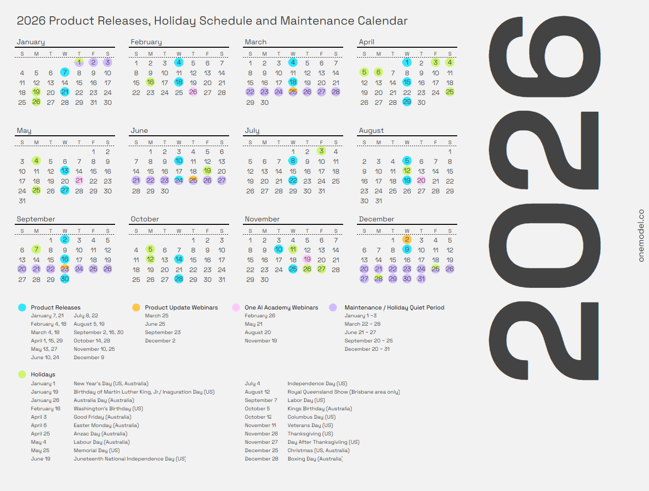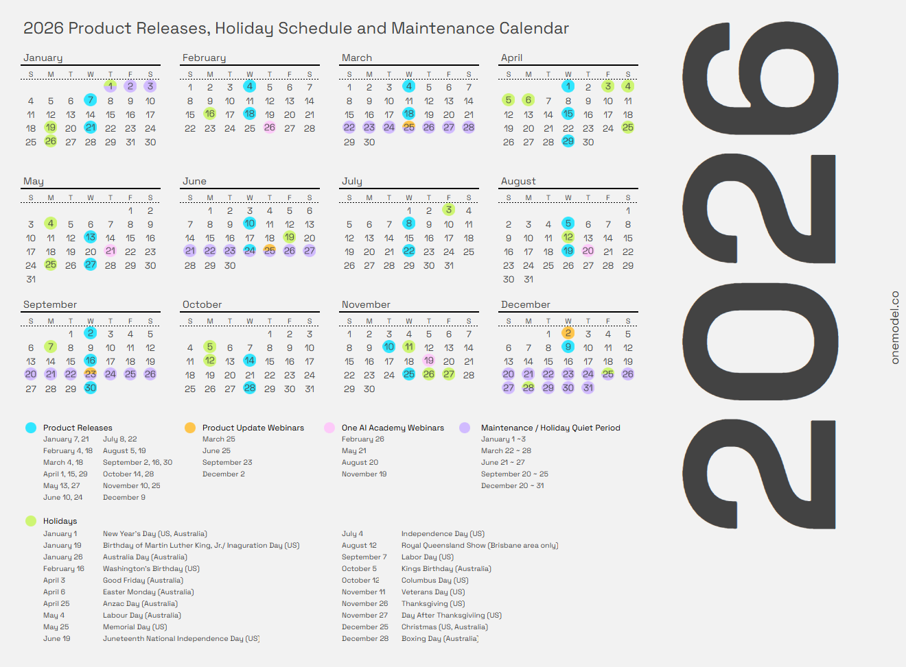 This article provides the latest product release calendar for One Model customers. It also includes other relevant dates such as our quarterly product release webinars for customers and planned maintenance periods for the Customer Success & Data Engineering teams.
