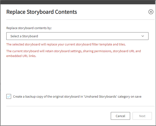 If you are an Admin or Storyboard designer in a large Organization with multiple users and viewers of Storyboards who bookmark or save the URL of each Storyboard, this feature enables you to make edits or changes and overwrite the existing Storyboard contents without altering the URL or breaking any other locations(e.g. SharePoint) that has this Storyboard embedded. In practical terms, this means that you can make changes seamlessly without disruption or interference with Storyboard users.