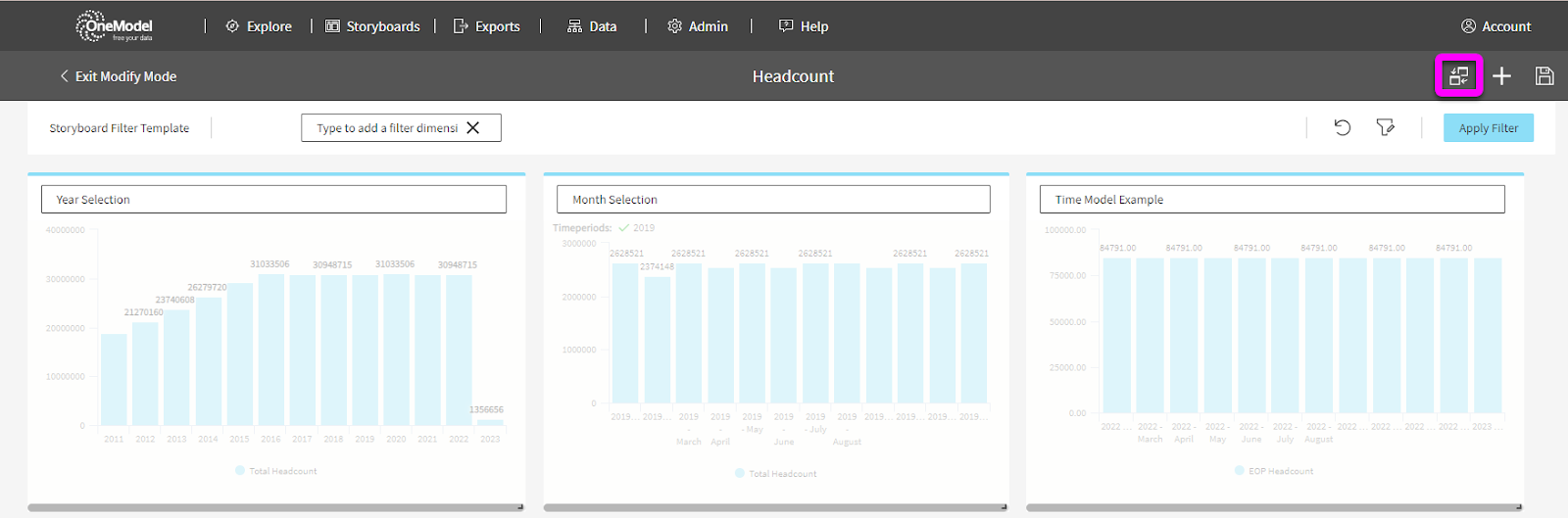 The Replace Storyboard Contents feature is available in the Modify Mode of a Storyboard (see screenshots below) and allows Storyboard designers and Admins (with the Replace Storyboard Contents Application Access Role permission, "Storyboard Administrator") to replace the tiles, tile contents, and the Storyboard filter template without changing the Storyboard ID. The Storyboard ID is an embedded part of each Storyboard’s unique web address (URL) and this is used as part of the Storyboard embedding feature. For more information check out our user guide in the One Model Help Center. (ref 14602)