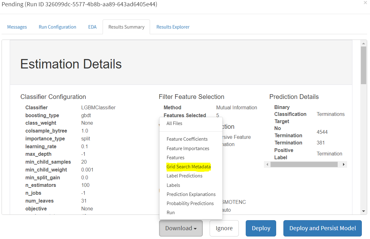 One AI’s machine learning pipeline is a series of processes that perform data cleaning and preparation, algorithm selection, and parameter optimization that ultimately produce a predictive model and predictions. This is to say that when you execute a run, a lot happens behind the scenes. In keeping with One AI’s philosophy that transparency in AI is the best policy, we are making the metadata for machine learning runs available for download. This file contains parameters, results, and performance measures for each of the various algorithm and configuration combinations that the pipeline attempts. It is formatted as a comma delimited text file. The file can be found by following these steps: