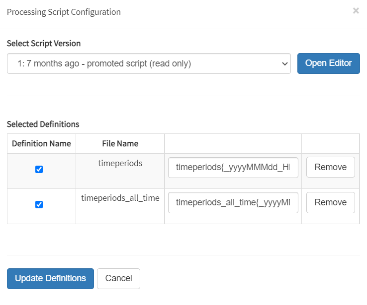 We've added the timestamp parameter in the File Name configuration for Data Destinations that come from Processing Scripts. This will change the configured file name from filename.csv to filename{datestamp_parameter}.csv. This Timestamp parameter can therefore be removed, or modified if desired.. (ref 2667)