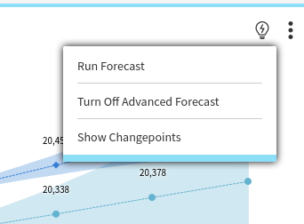 • Changepoints: With the Advanced Forecaster, you have the option to render changepoints within the chart as well. Changepoints occur in the first 80% of the historical data ( not the forecasted / future data ). Changepoints can help you understand when the Advanced Forecaster thinks meaningful changes in trends occurred over time. We don't display the changepoints by default, but after running the Advanced Forecaster, a new show changepoint option appears in the lightbulb menu, shown below. Clicking on any of the forecasted data points will pop up an explanation of change points as well as a list of the detected changepoints.