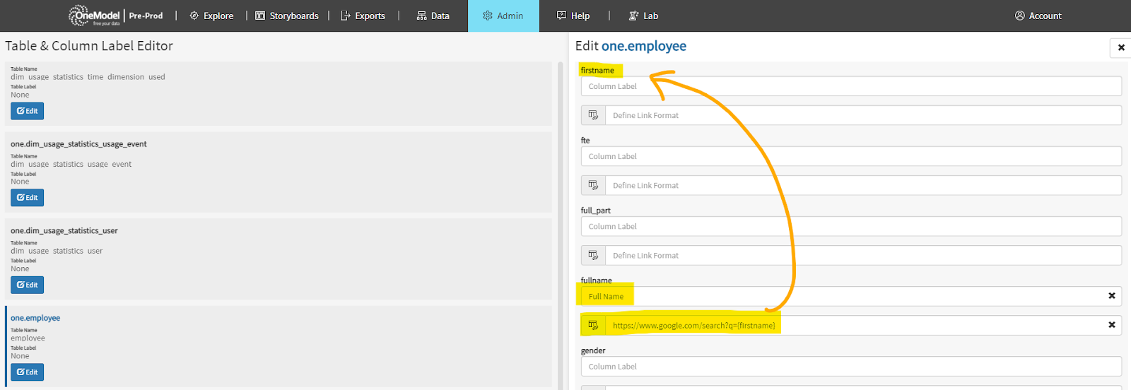 In addition to the existing option to rename a column label, you can see that there is now a new field where you can define a hyperlink. This is a text field where you can type in the relevant standard link information for the target system and you are able to include within this text reference to another field within the same One Model table. These reference fields should use the original field name and be bound with {curly brackets}. The screenshot below contains a simple example using Google Search as the target system and it is dynamically appending the employee’s first name.