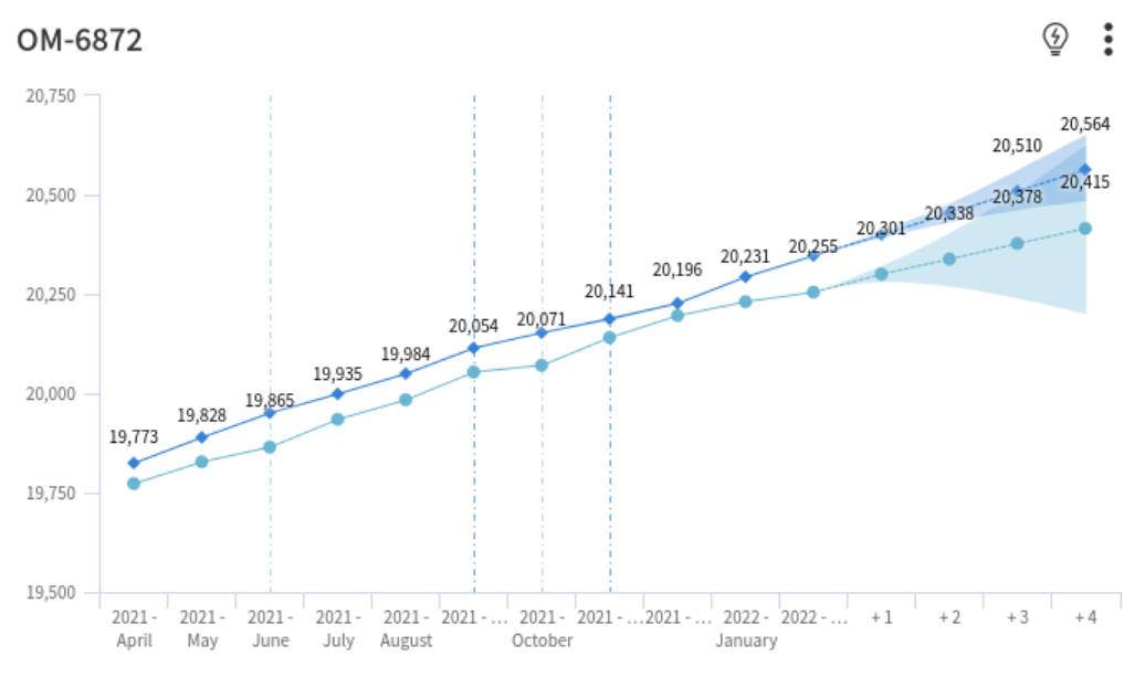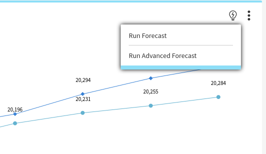 • Advanced Forecasting: With the release of OneAI V2 we have added a new forecaster embedded within Storyboards. Currently, the feature is behind a flag that needs to be turned on per client so please contact your One Model Customer Success contact if you are interested in giving it a try. The new Advanced Forecaster exists alongside the existing Forecaster as each forecasting type has its own use case. The Advanced Forecaster is meant for forecasts with larger data sets and the potentiality of seasonal trends. The existing Forecaster is intended for smaller data sets that are unlikely to have seasonality. Because the Advanced Forecaster is configuring and measuring much more than the existing Forecaster, it can take a bit longer to run. Both forecasters can be accessed from the lightbulb dropdown on a time series line chart, shown below.
