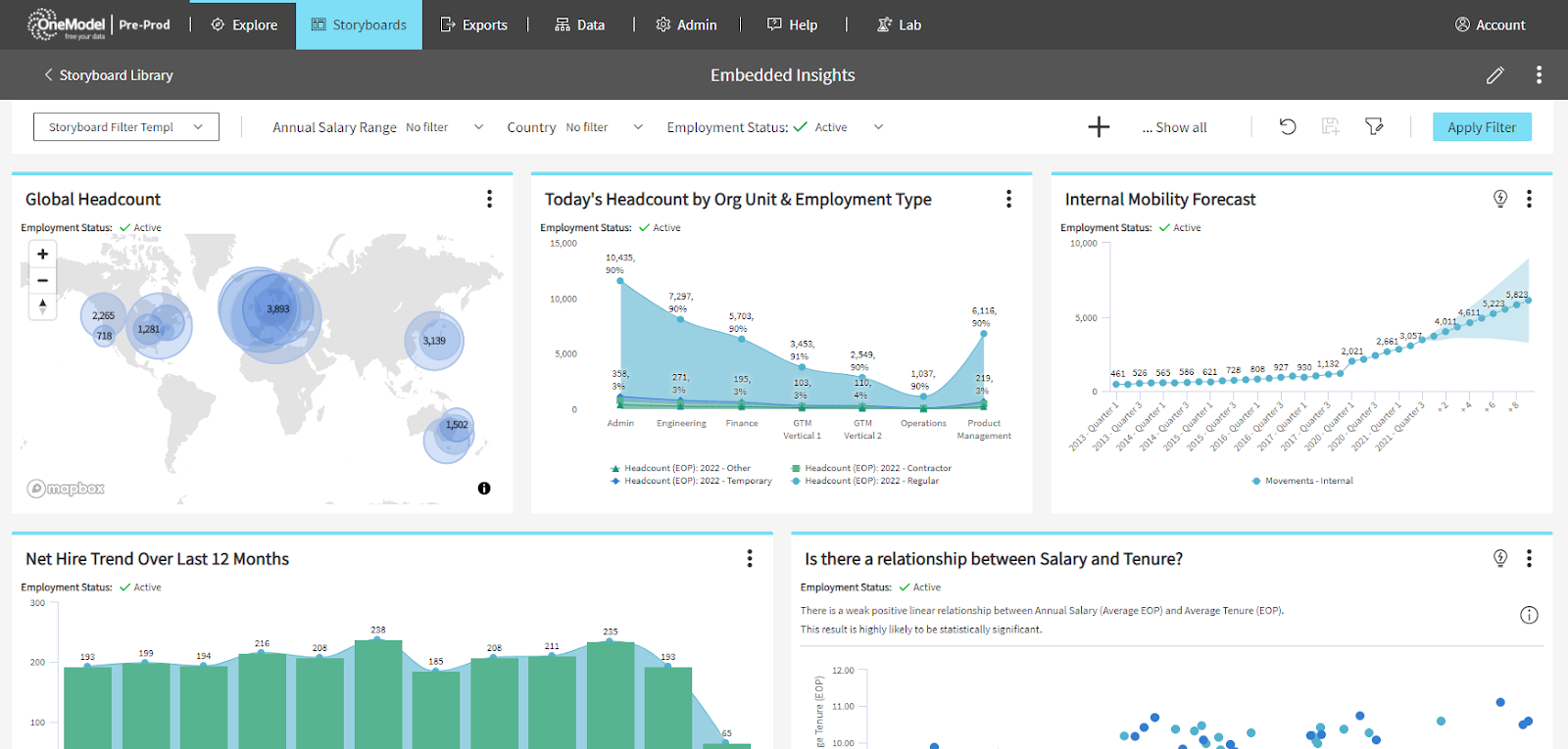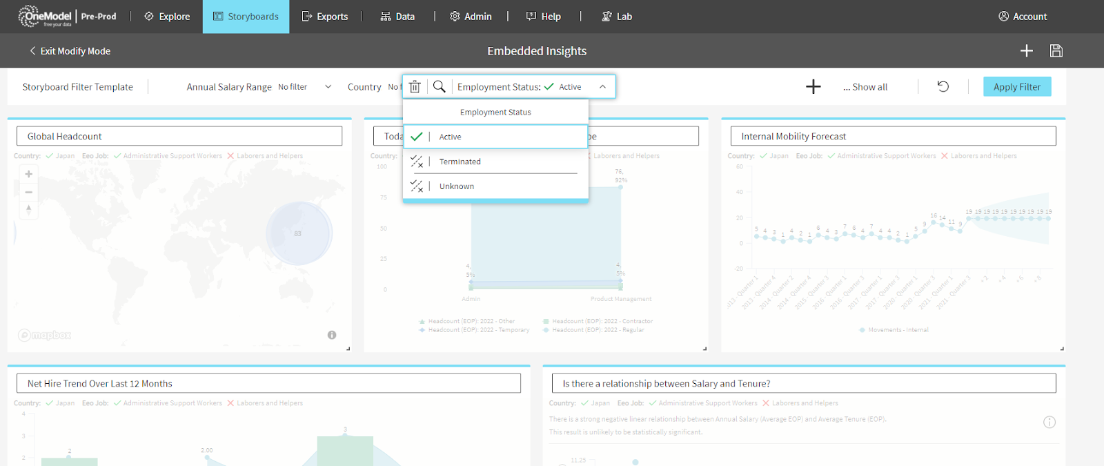 In this release we added an enhancement to the Storyboard Filter Template so that a Storyboard designer can also set the initial state of actual selections with filter dimensions. Today some customers have common filters that they are adding to all of the tiles in a Storyboard one-by-one, so this new enhancement will make the management of these Storyboards much easier. A good example of this is when you might want all of the content in a Storyboard filtered to include or exclude contingent workers, or just active employees. You can apply these filter selections while editing the Storyboard to see what it will look like before saving the Storyboard.