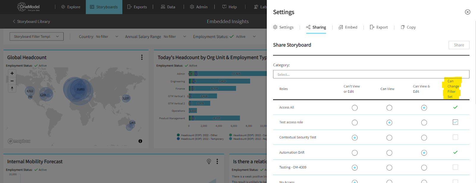 We tightened up an inconsistency in how Storyboard permissions were being applied under some specific scenarios. When a Storyboard was being shared with a role, and at the time of sharing the Storyboard was set as able to be edited, anyone with that role would be able to edit the Storyboard whether or not the user has the Application Access Permission for creating/editing Storyboards "CanCreateDashboard". From this release, a user will need to be in a role that has the "CanCreateDashboard" enabled to edit a Storyboard however it was shared (ref 11727).