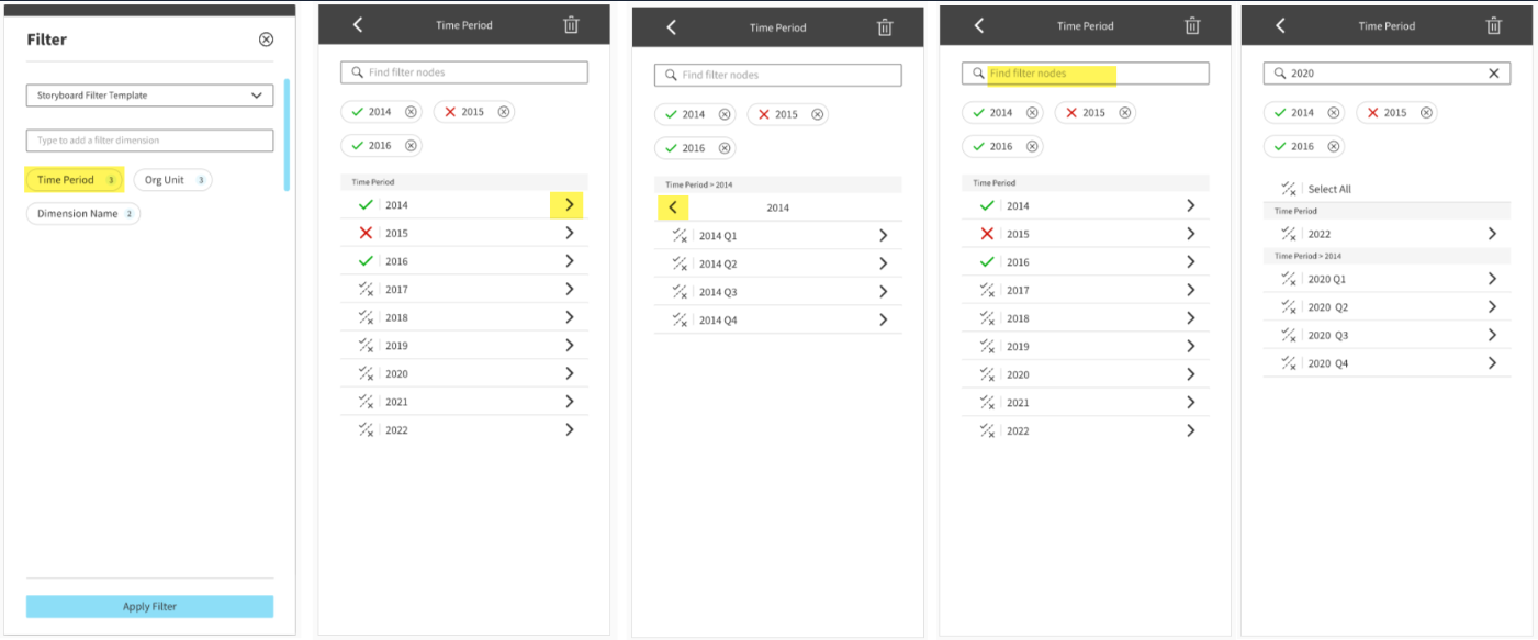 Continuing our enhancements for the mobile device user experience, in this release we have delivered a new Storyboard filter bar tailored for mobile devices. The filter bar is optimized for small screens and also touch interactions, you can add new filter dimensions and then tap the dimension to browse or search for filters to include or exclude. (ref 11056)