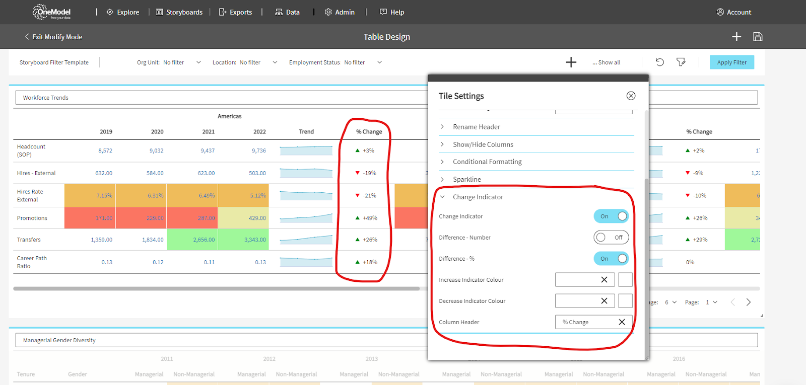 Complementing the recently released sparklines feature, in this release we have added the ability to include a change indicator and number or percentage to a table. The change is measured across the last two time periods in your table.