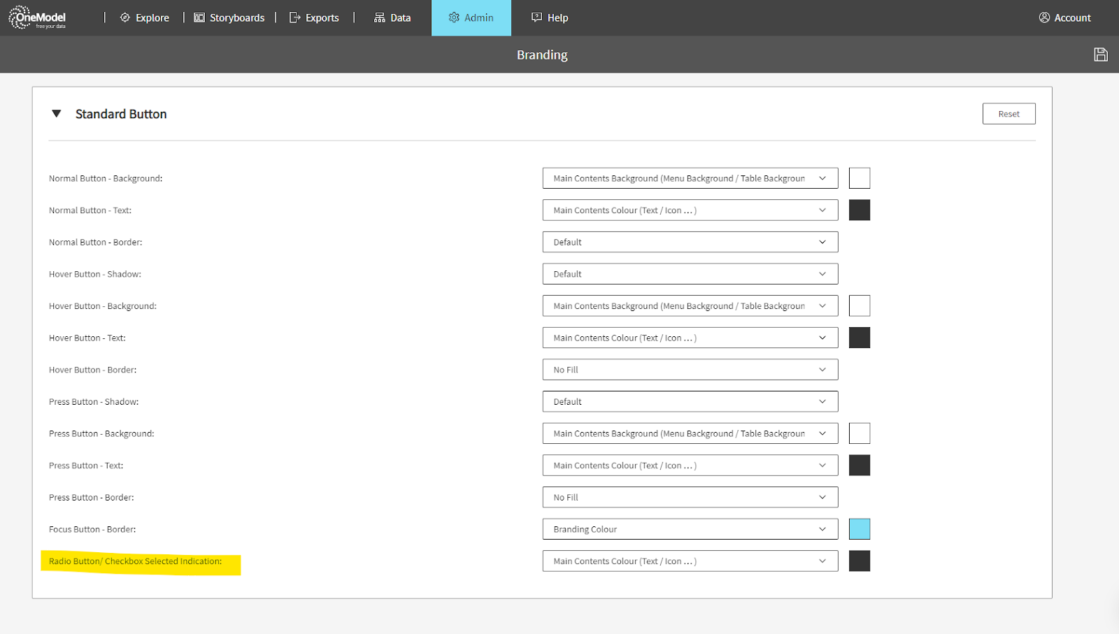 We improved the color handling for radio buttons and checkboxes, most notably used for sharing Storyboards and in a few other places. If your company branding uses a very light branding color, it could make the checkboxes and radio buttons hard to read. To address this we have added a new option into the branding settings specifically for these components, it is under the Standard Button section called “Radio Button/ Checkbox Selected Indication”. (ref 12260)